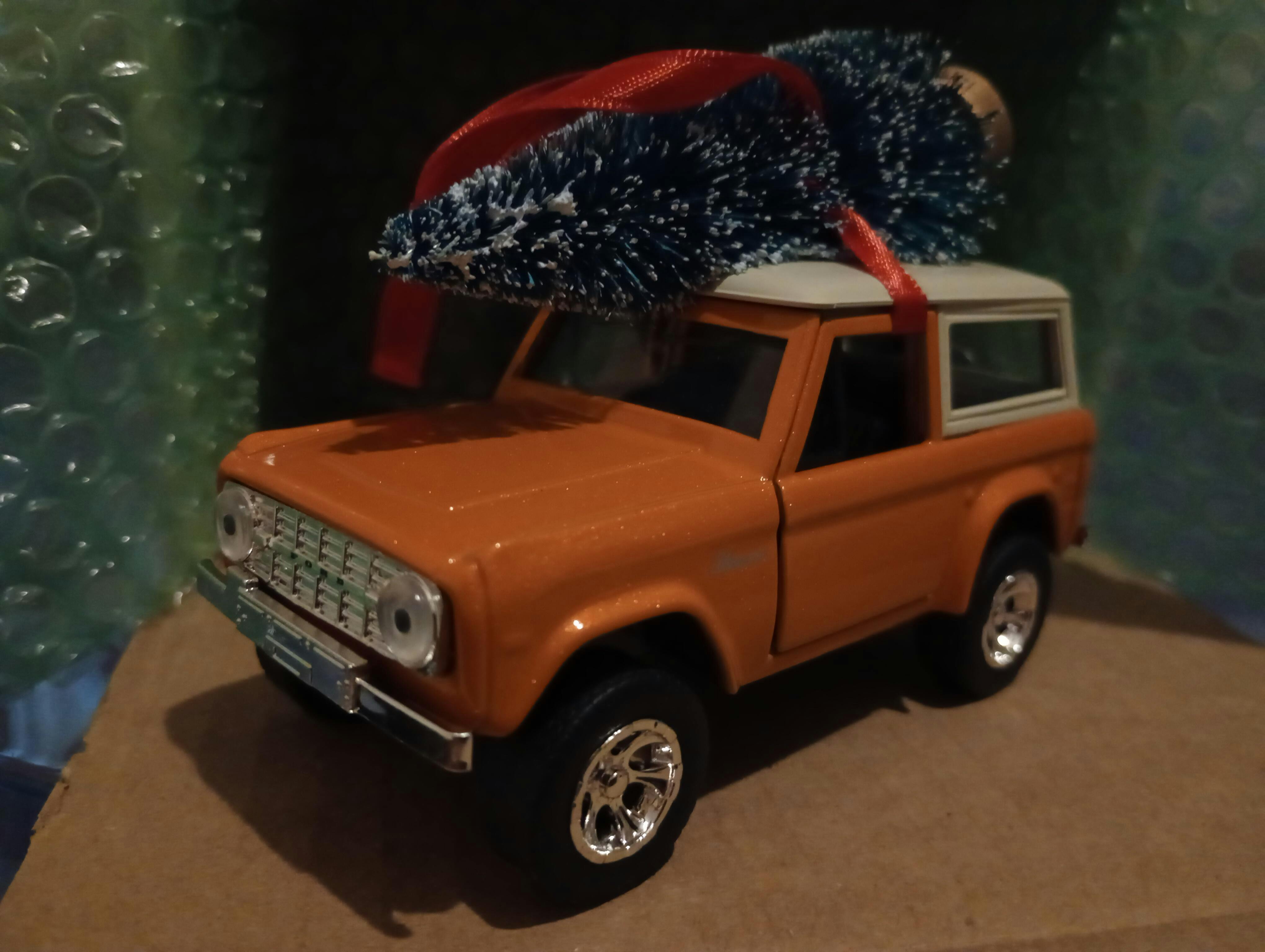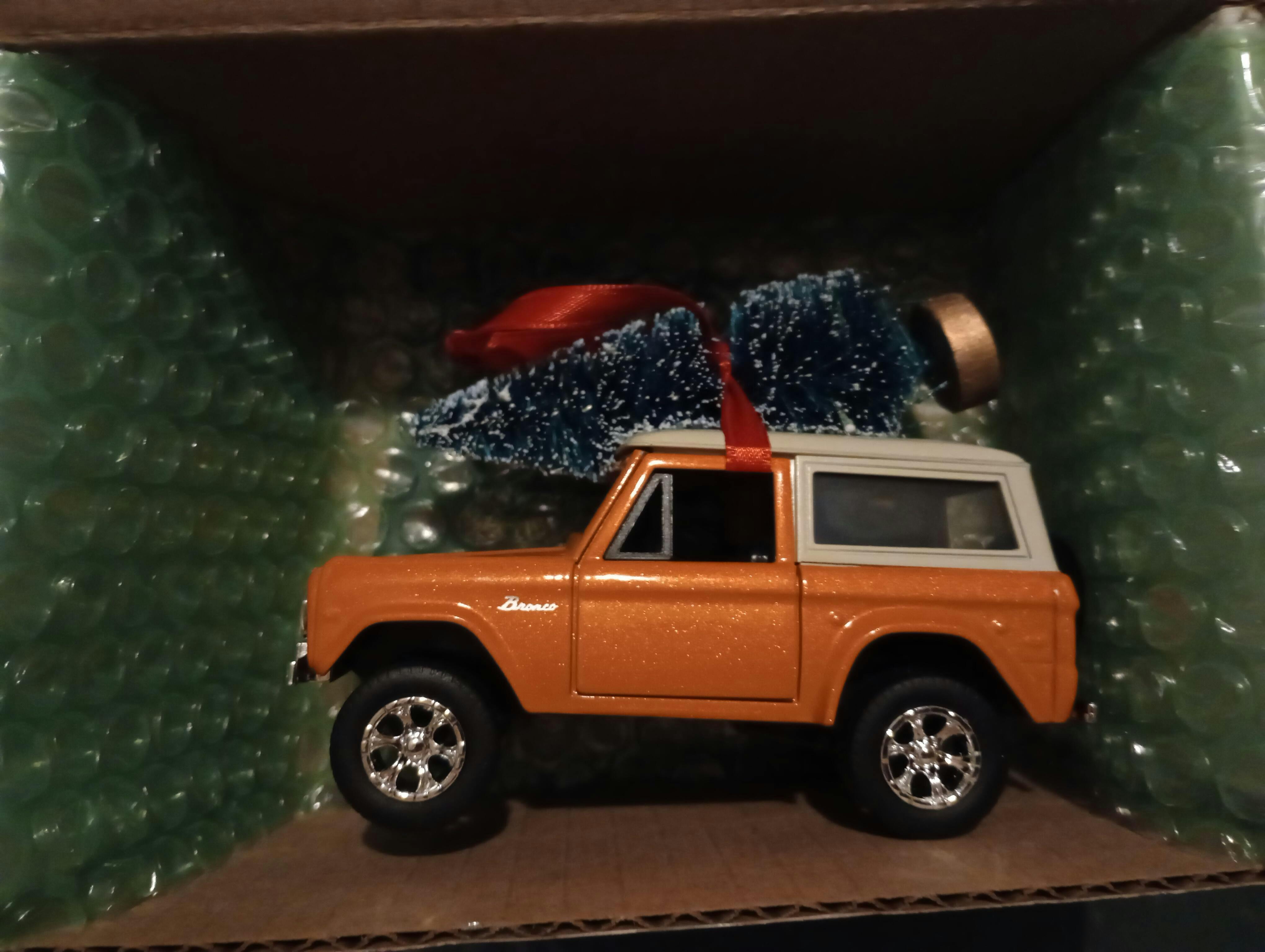Ordered the Ford Bronco ornament and it's perfect! Ordered pretty late, but it still arrived quickly, and safely nestled in bubble wrap. The paint is beautiful and glossy. It actually rolls and (if there wasn't a ribbon holding the Christmas tree) the front doors open. It's a heavy metal vehicle, not cheap plastic. Great quality at a great price! Can't wait for it to get opened on Christmas morning! Already trying to decide on another one to get for next year!
